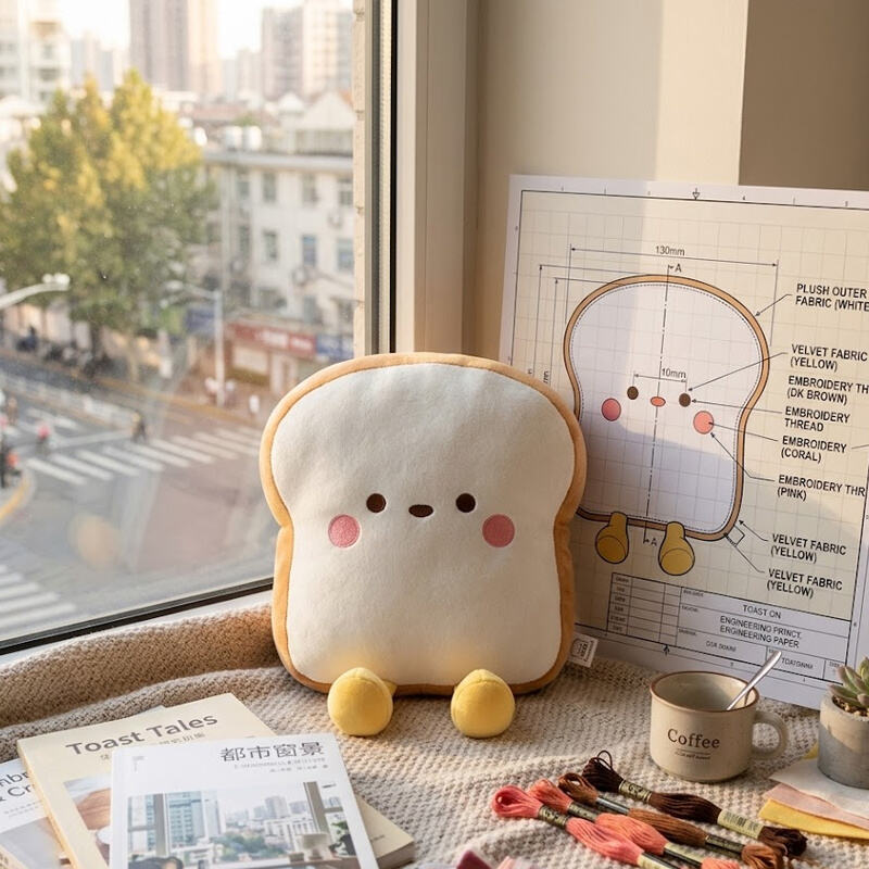 Tento polštář ve tvaru kousku toastu je příkladem klasického designu **„Uzdravujícího stylu“**, který dokonale spojuje minimalismus s antropomorfními prvky. Následuje podrobná analýza v třech klíčových dimenzích: design výrobku, kvalita materiálu a tržní atraktivita:
