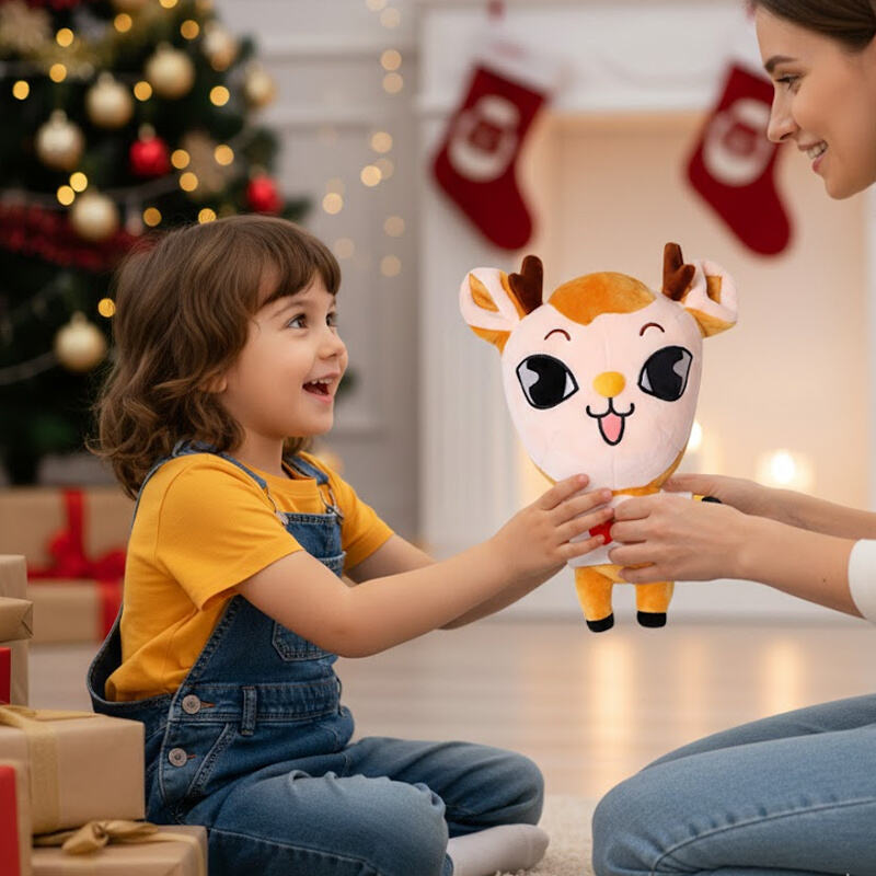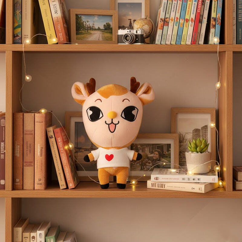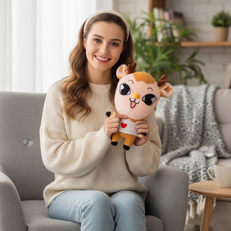 This is a lively and comforting deer-shaped plush toy. Its design cleverly blends "cute aesthetics" with "anthropomorphic expression," using exaggerated proportions and soft colors to create a playful yet affectionate companion.