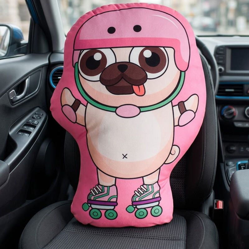 The entire pillow embraces a highly contemporary "Dopamine" color palette. The background and the Pug's accessories—including the helmet, skate uppers, and elbow pads—are unified by a high-saturation rose-pink hue, creating a visual impact that is both sweet and vibrant.