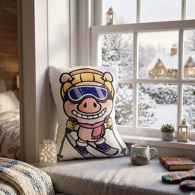 Breaking the Mold: Unlike traditional square or round pillows, this item features a unique, contoured cut that follows the exact outline of the graphic design. This approach brings the image of the skiing piglet to life in three dimensions, creating a powerful visual impact and serving as a striking decorative piece.