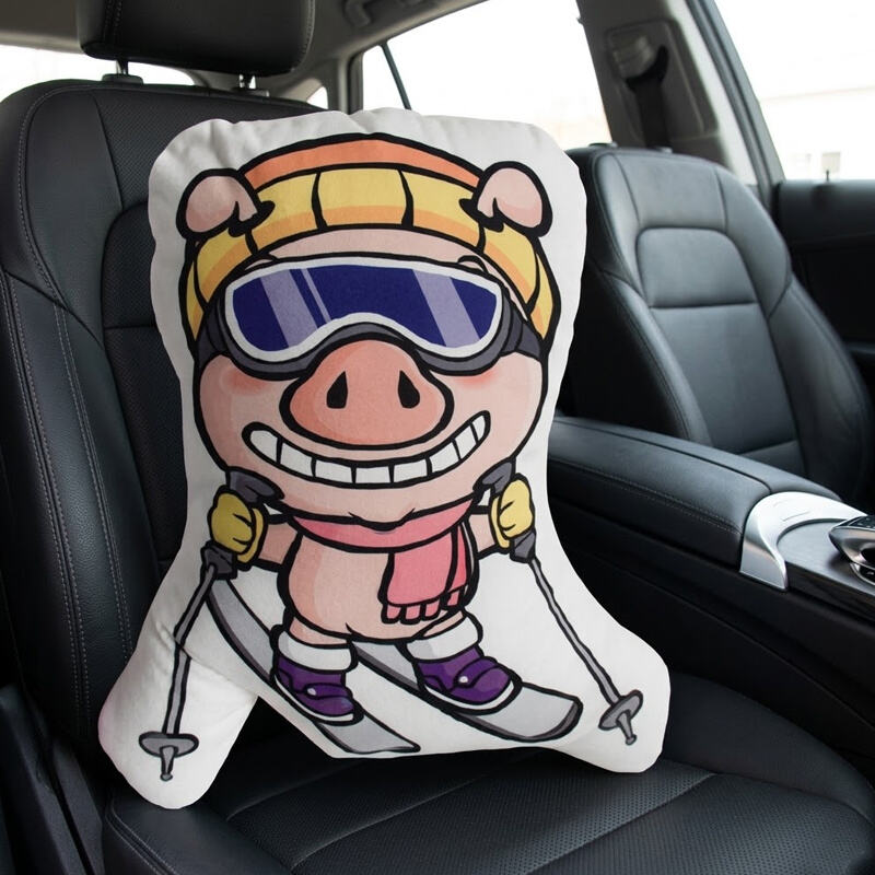 The throw pillow features an endearing little pig as its central character, cast in the role of a "Skiing Ace." Breaking away from traditional square or round pillow shapes, this product utilizes a custom-cut design; it is sewn to follow the dynamic contours of the skiing pig, giving it the appearance of a three-dimensional cartoon plush toy. This contoured design enhances the product's tactile appeal and creates a strong visual impact that immediately catches the eye.