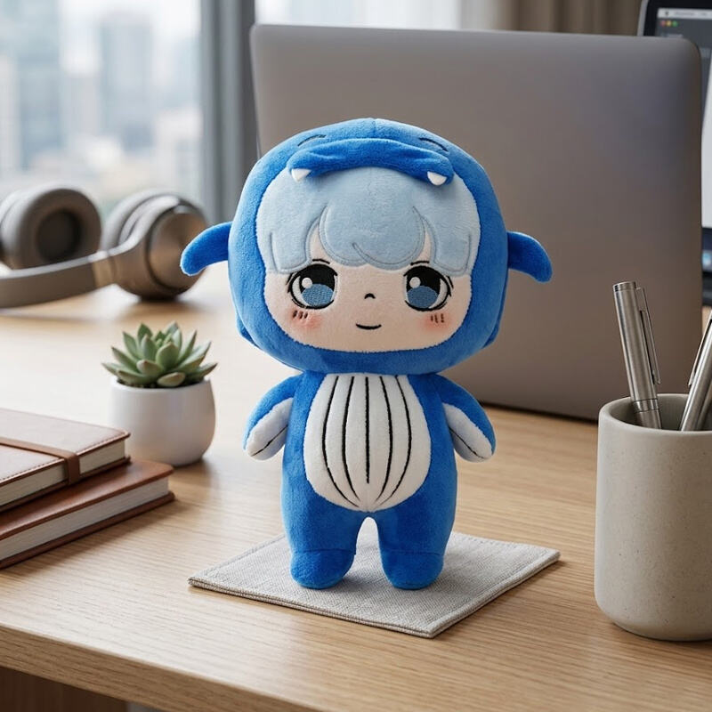 It's a typical "workspace companion." In a dull office environment or on a desk, such a bright blue doll can instantly break the monotony of the space, becoming a visual anchor for relieving work stress.